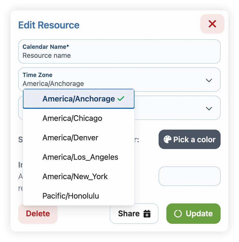 In "Calendar Name", enter the desired name for your resource. We recommend using something that will help everyone in your business easily identify it. “32’ Seavee, Cabin 1, Silver Pontoon, etc.”