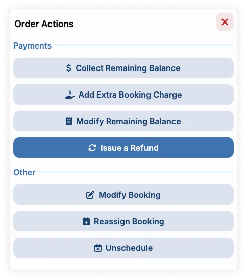 - On the booking you want to refund, click "Order Actions" button, and then select "Issue a refund"