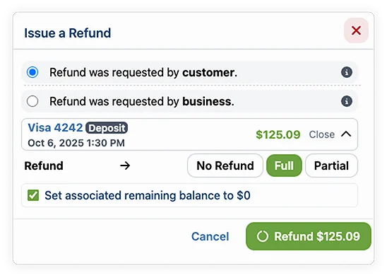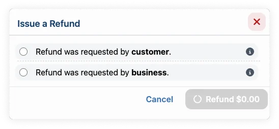 - Requested by customer: A cancellation of the service by your customer within the bounds of your cancellation policy. Fees are not returned to the customer.
