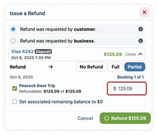 - Partial: Allows you to customize the refund by selecting specific bookings and entering a custom refund amount