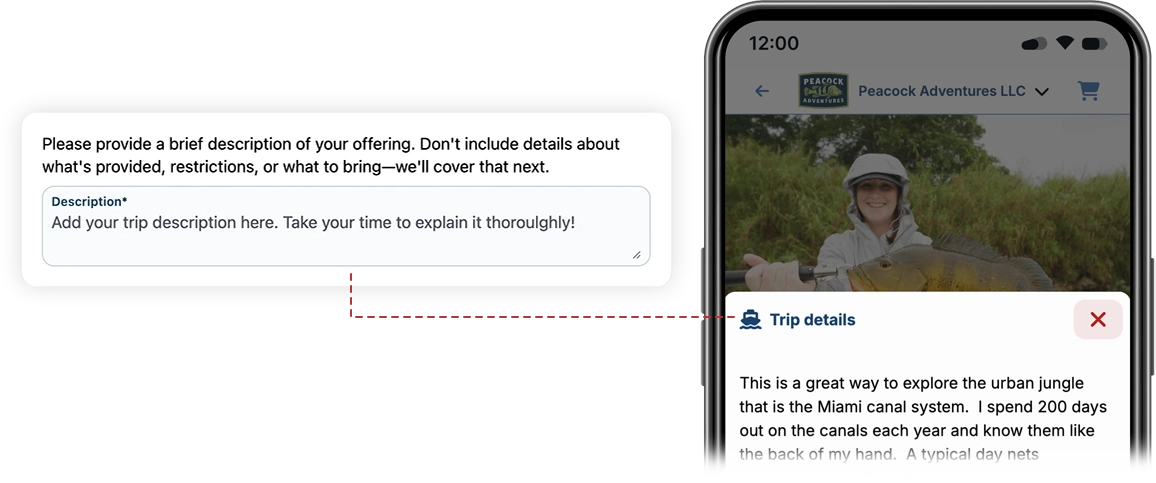 - Provide a description for your trip/offer. This is the best place to tell your customers what your offering is all about.