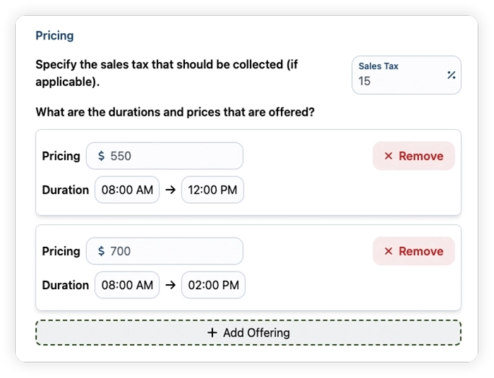 - Enter the duration options your offer possess and their associated prices. Optionally, add the sales taxes that should be collected.