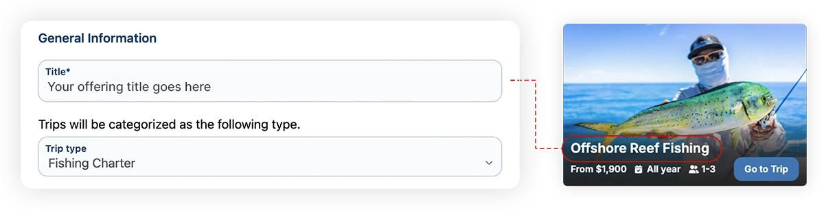 - Enter the title and category for the trip/offer. The title is what will be displayed on your customer booking page, for example: