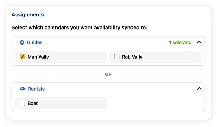 - Select the calendars you want associated with the booking. You can select either Guides or Resources.