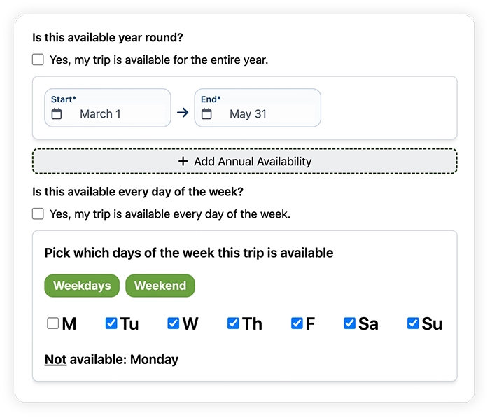 - Set up the timezone and yearly availability of your offering. If you only offer the trip during certain months of the year or days of the week, enter them here.