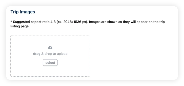 - Upload images for your trip. These must be JPEG or PNG files, with suggested aspect ratio of 4:3. Also in this step, select a cover photo for your offer.