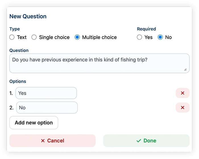 - Add any questions for your customers to answer during checkout. Additionally, you can manage your questions in the "Trip Questionnaire" page.